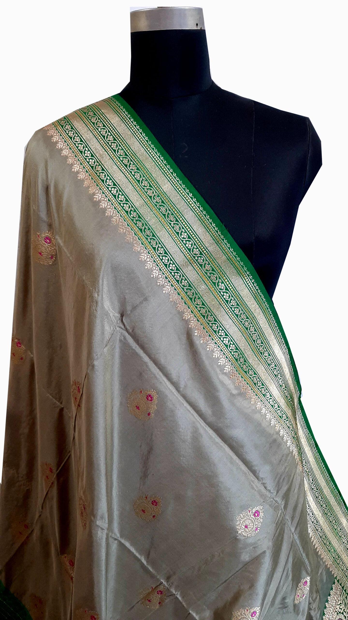 The saree is adorned with a captivating combination of olive and green colors, creating a harmonious blend that is both elegant and visually striking. With its rich history and impeccable craftsmanship, the Banarasi Kadhwa Silk Saree with Meenakari border is a timeless classic, making it a cherished addition to any woman’s wardrobe for special occasions and celebrations.