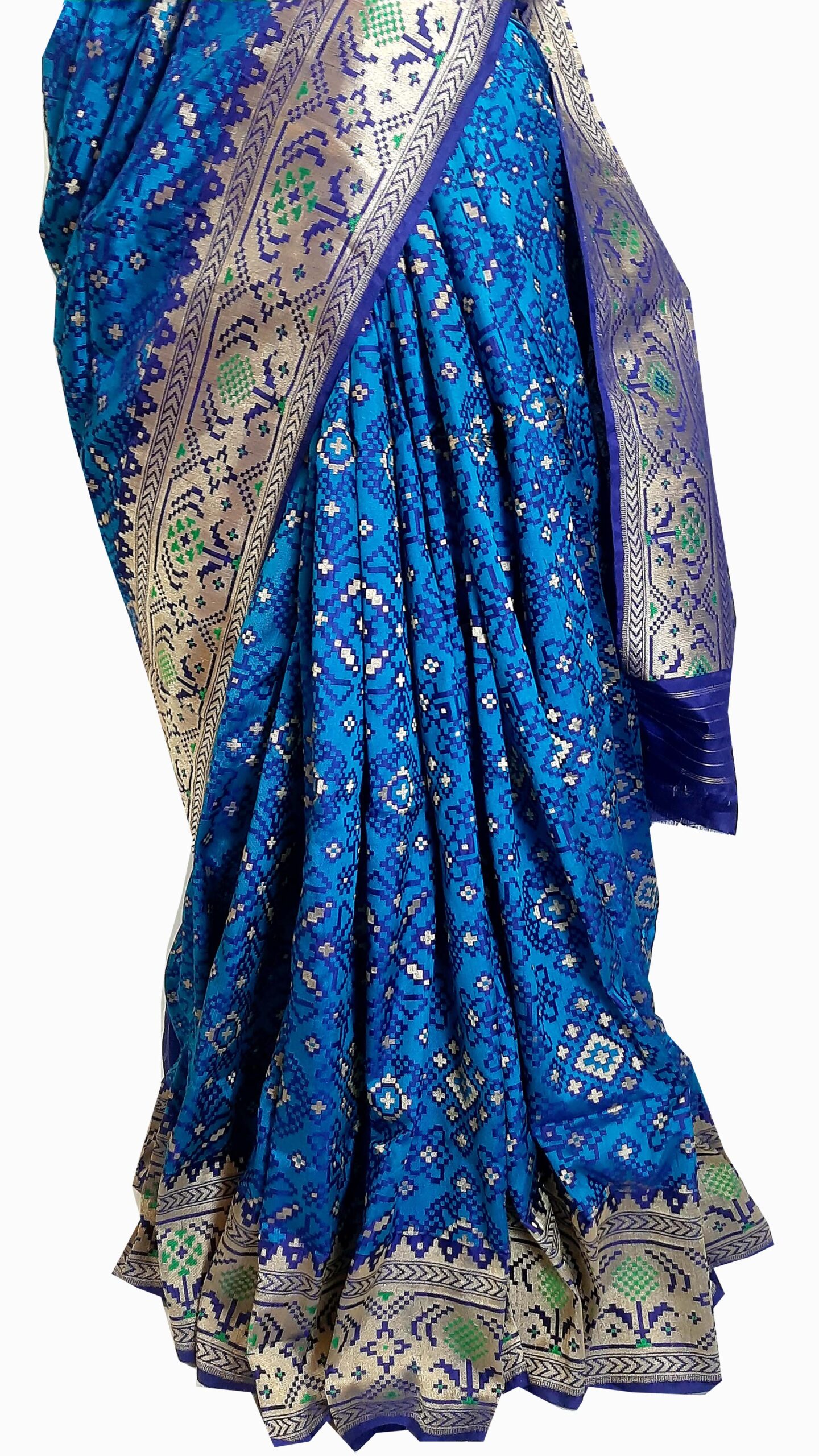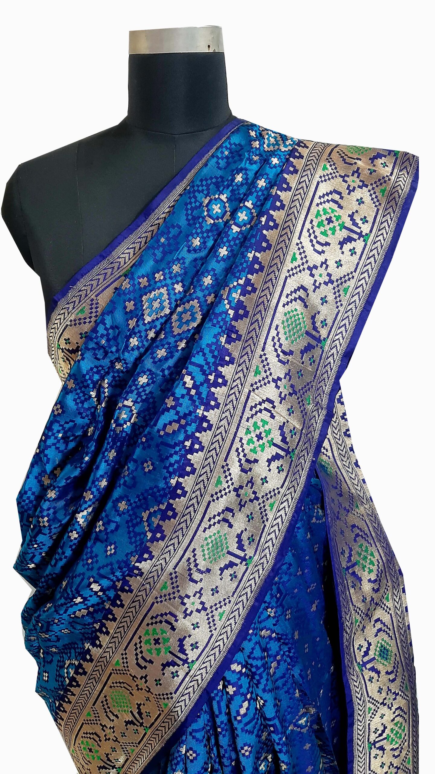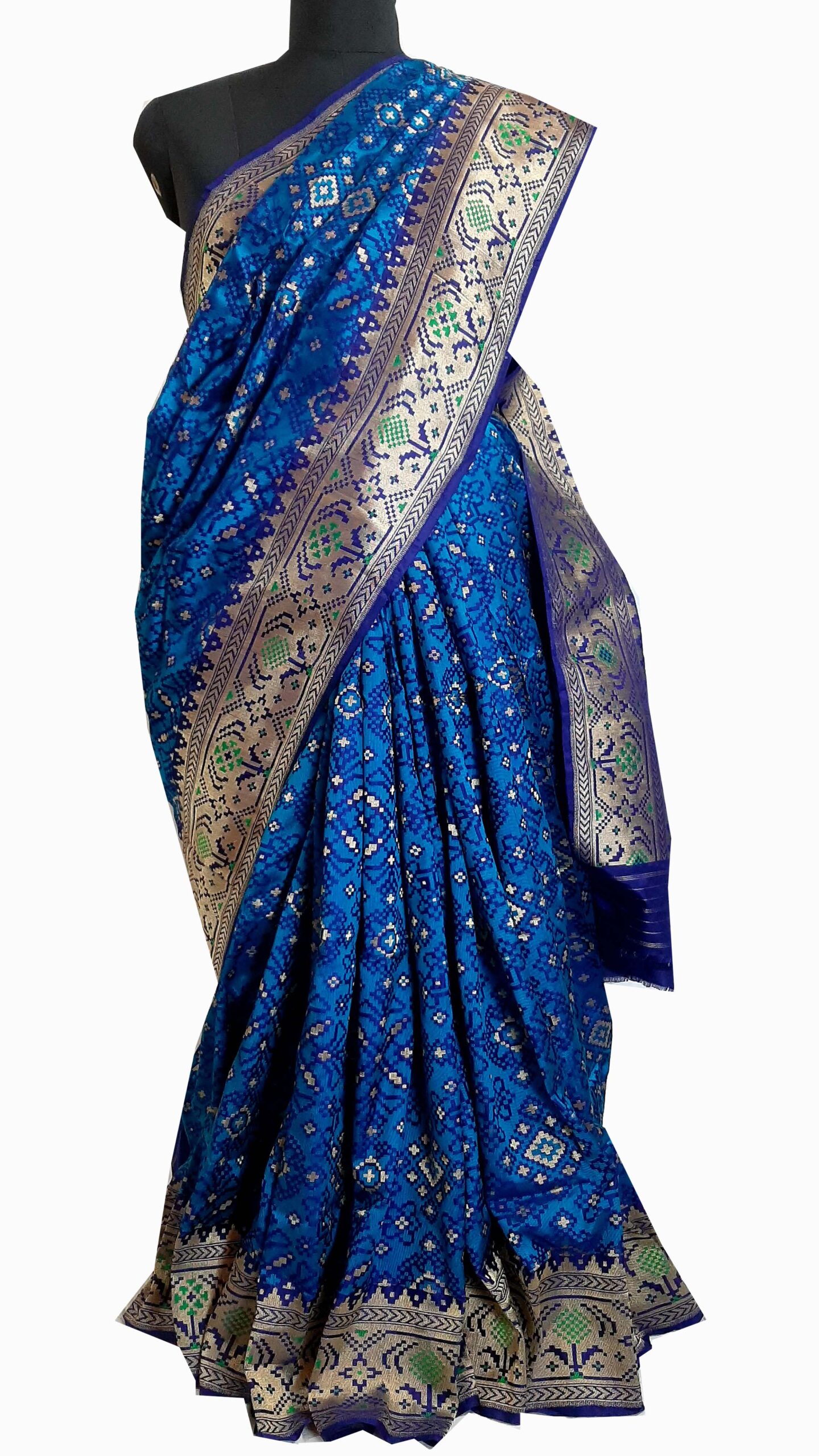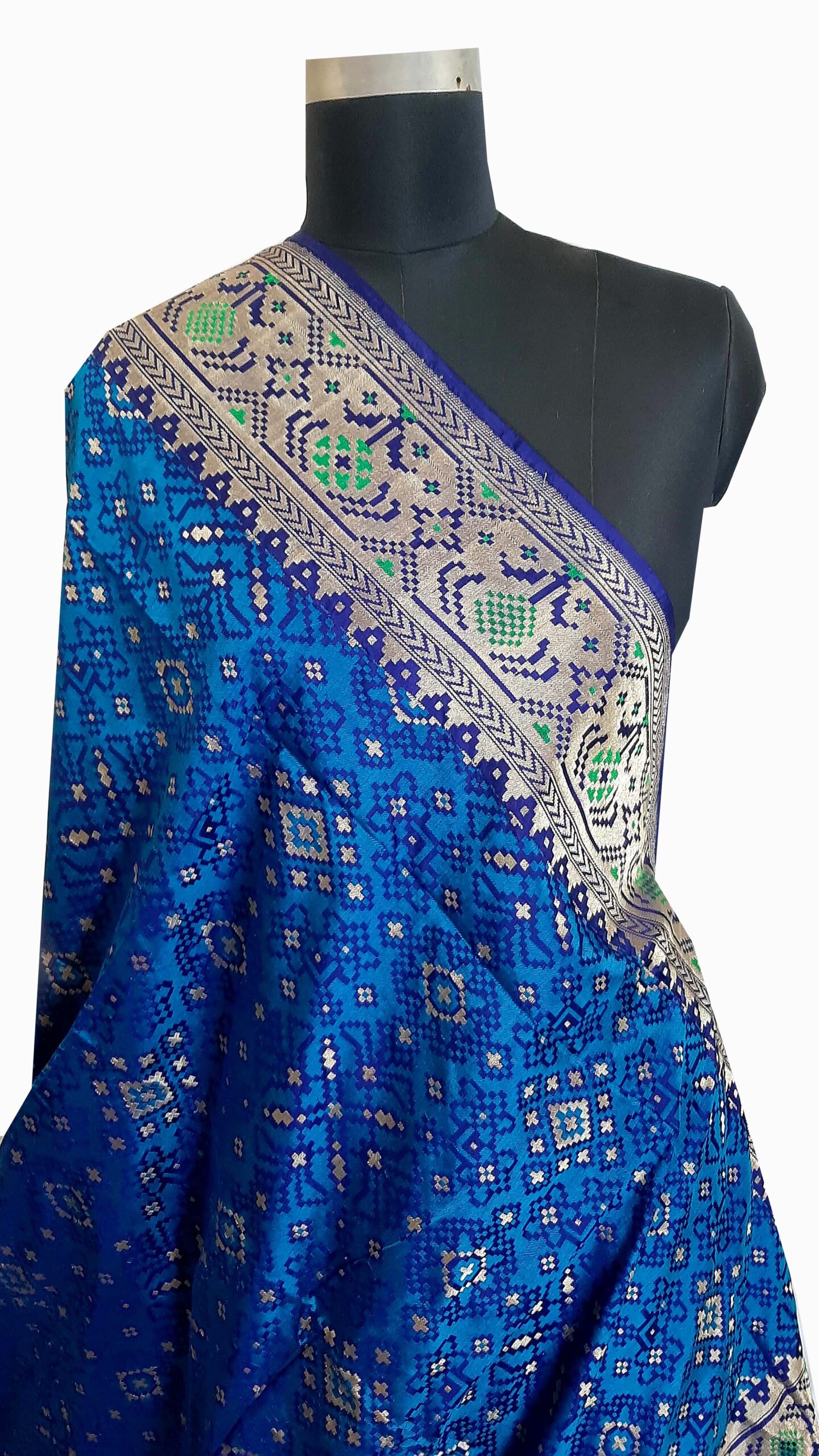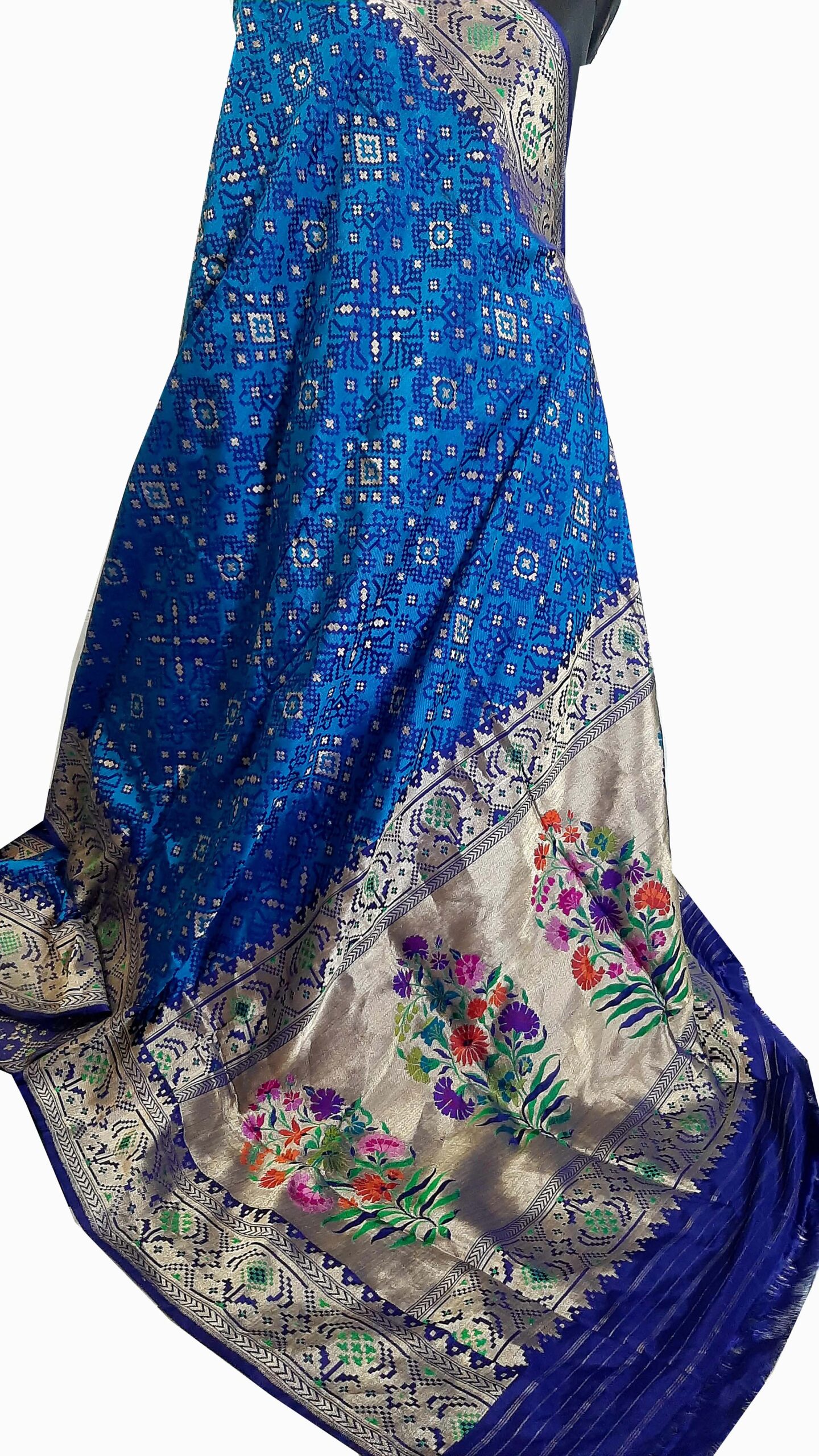 Experience the exquisite artistry of Banarasi artisans with the Banarasi Patola and Paithani combination silk saree in a mesmerizing shade of blue. This handwoven masterpiece seamlessly marries the intricate geometric patterns of Patola with the vibrant colors and gold zari work of Paithani, creating a textile marvel that’s a testament to India’s rich weaving heritage. The careful craftsmanship and attention to detail by these skilled artisans result in a stunning piece of wearable art that celebrates tradition and elegance. Draped in this Banarasi JPatola with Paithani combination silk saree, you’ll not only feel regal but also carry with you the legacy of centuries-old weaving traditions.