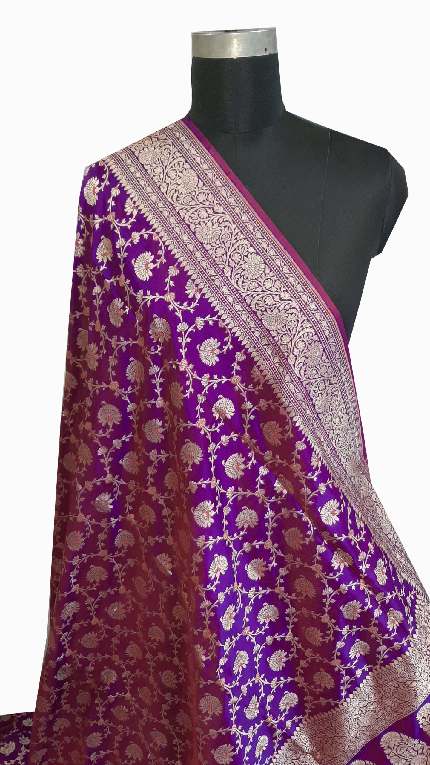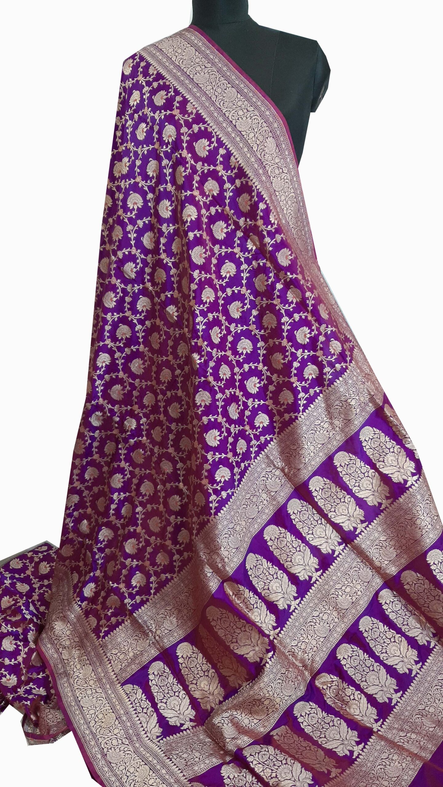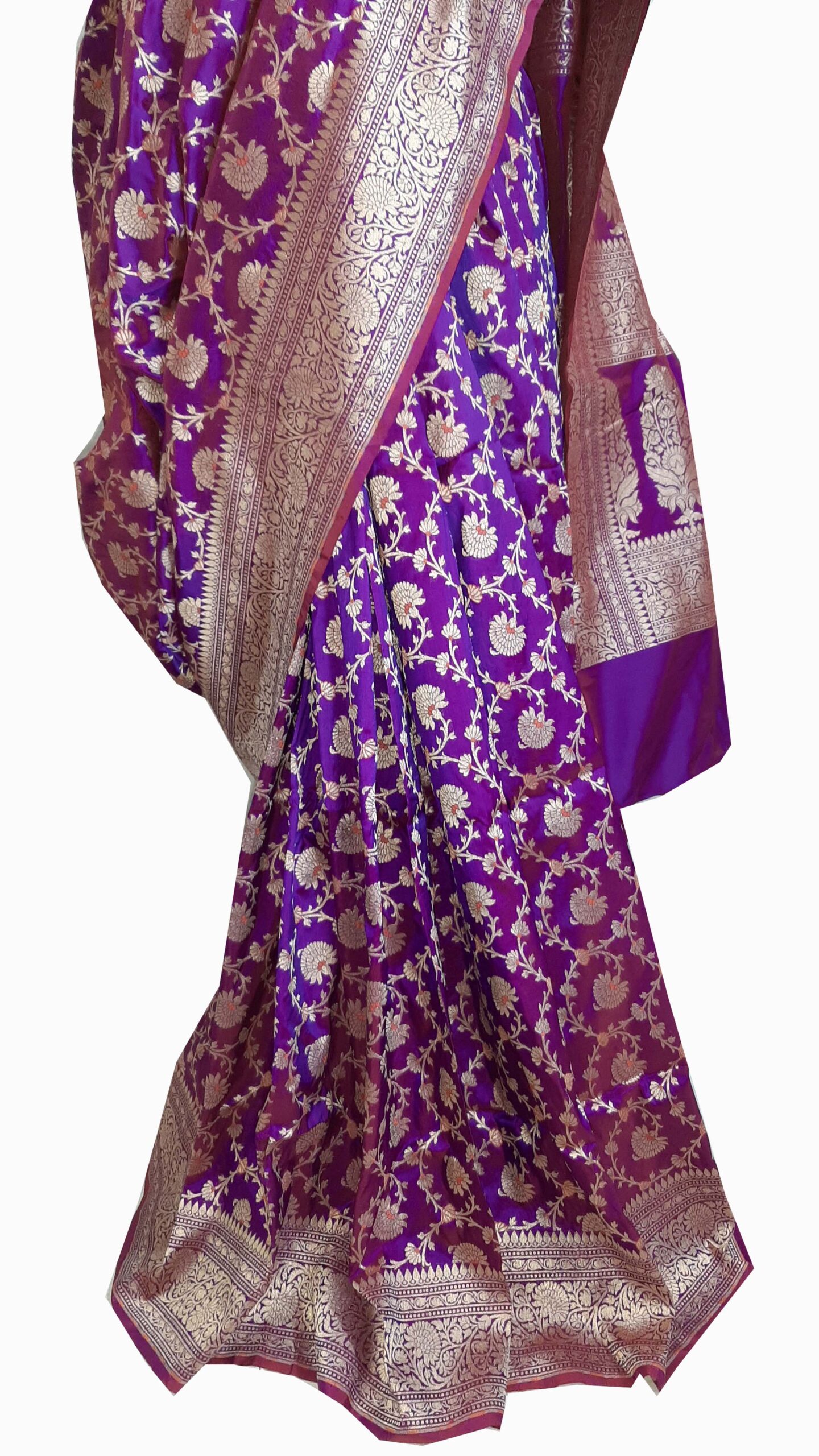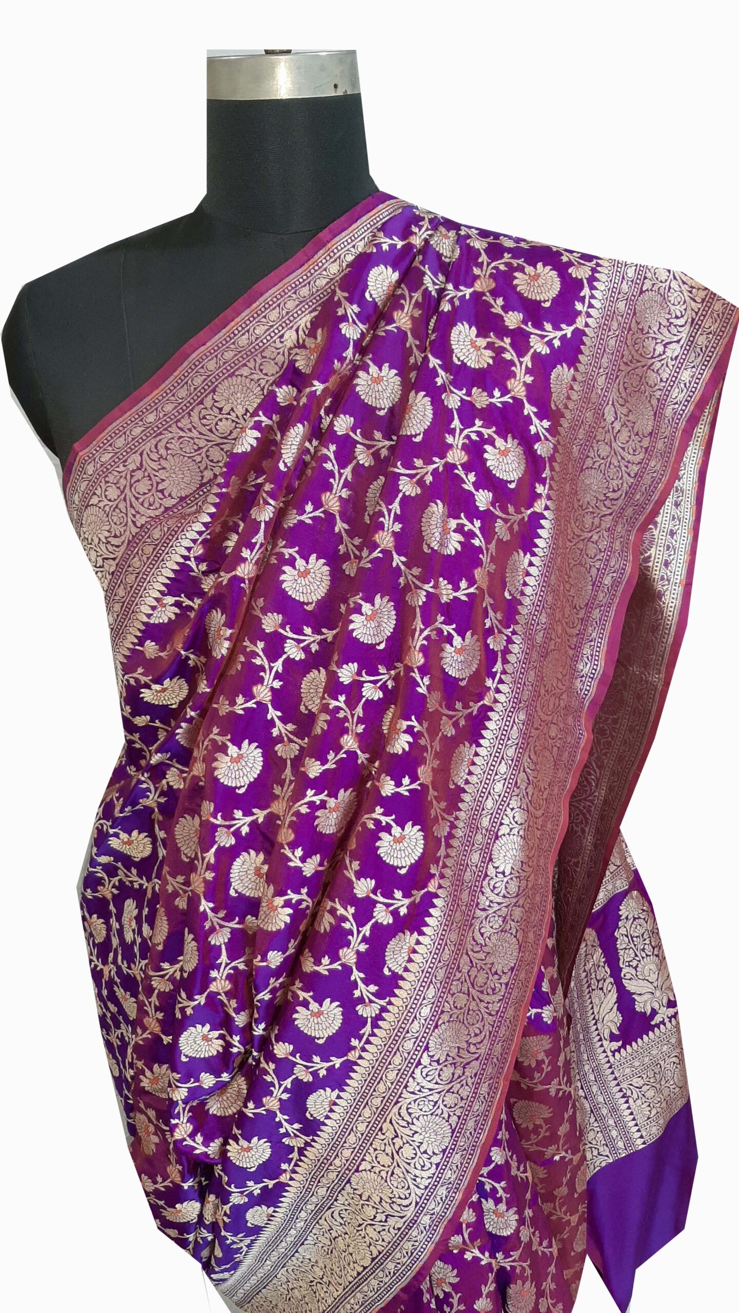 This particular saree comes in a stunning shade of purple, which symbolizes royalty and sophistication. The rich, regal color is further enhanced by the dazzling Meenakari motifs that adorn the fabric. The handcrafted Meenakari designs incorporate a myriad of colors, often featuring floral patterns, paisleys, and intricate geometrical shapes, making each saree a true work of art.