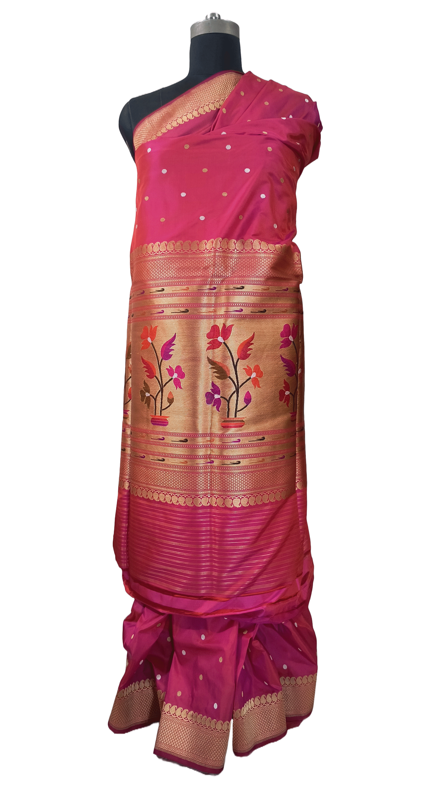 This exquisite pure handmade Paithani silk saree is a masterpiece crafted by a skilled Banarasi artisan, showcasing the timeless beauty of traditional Indian craftsmanship. The saree features a stunning Meenakari design, where intricate patterns are meticulously hand-painted and embellished with vibrant colors, adding a royal touch to the fabric. The Rani hue radiates elegance and warmth, making it perfect for special occasions, weddings, and festive celebrations. The heavy designer blouse two tone color, complements the saree with its intricate detailing, enhancing its grandeur. Taking 1 to 2 months to complete, this saree is a testament to the artisan’s dedication and expertise, making it a treasured addition to any wardrobe.